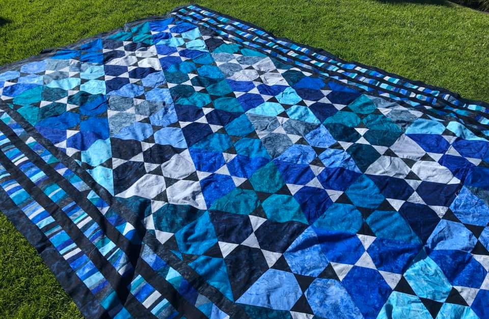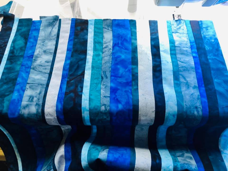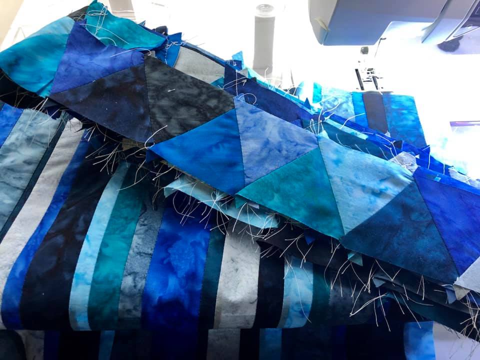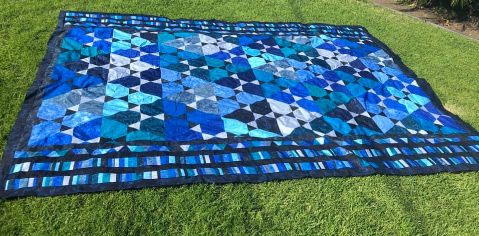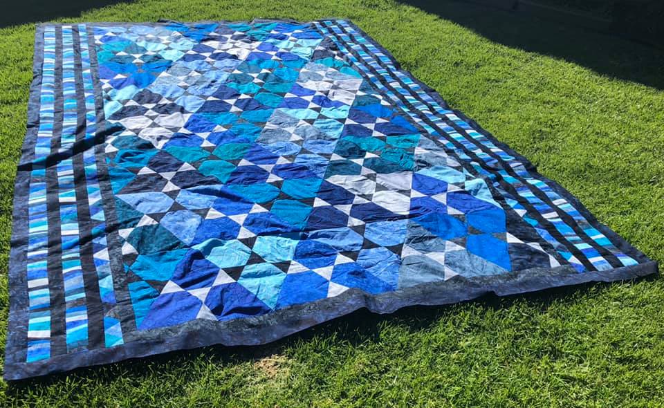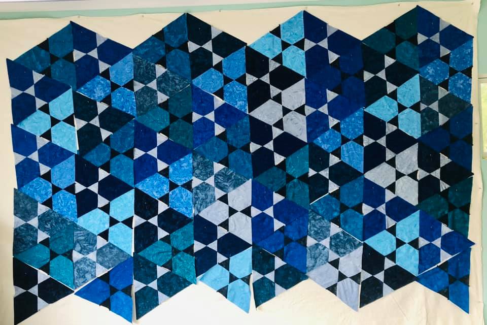 I can’t get enough of these blue batiks, nor apparently can I get enough of Jaybird patterns. So here’s a blue batik Lotus quilt. It sewed up rather long and skinny so I improvised some striped and triangley borders with the scraps. Although this is just a top for now, I think it already has a home so I will be completing the quilting as soon as possible.