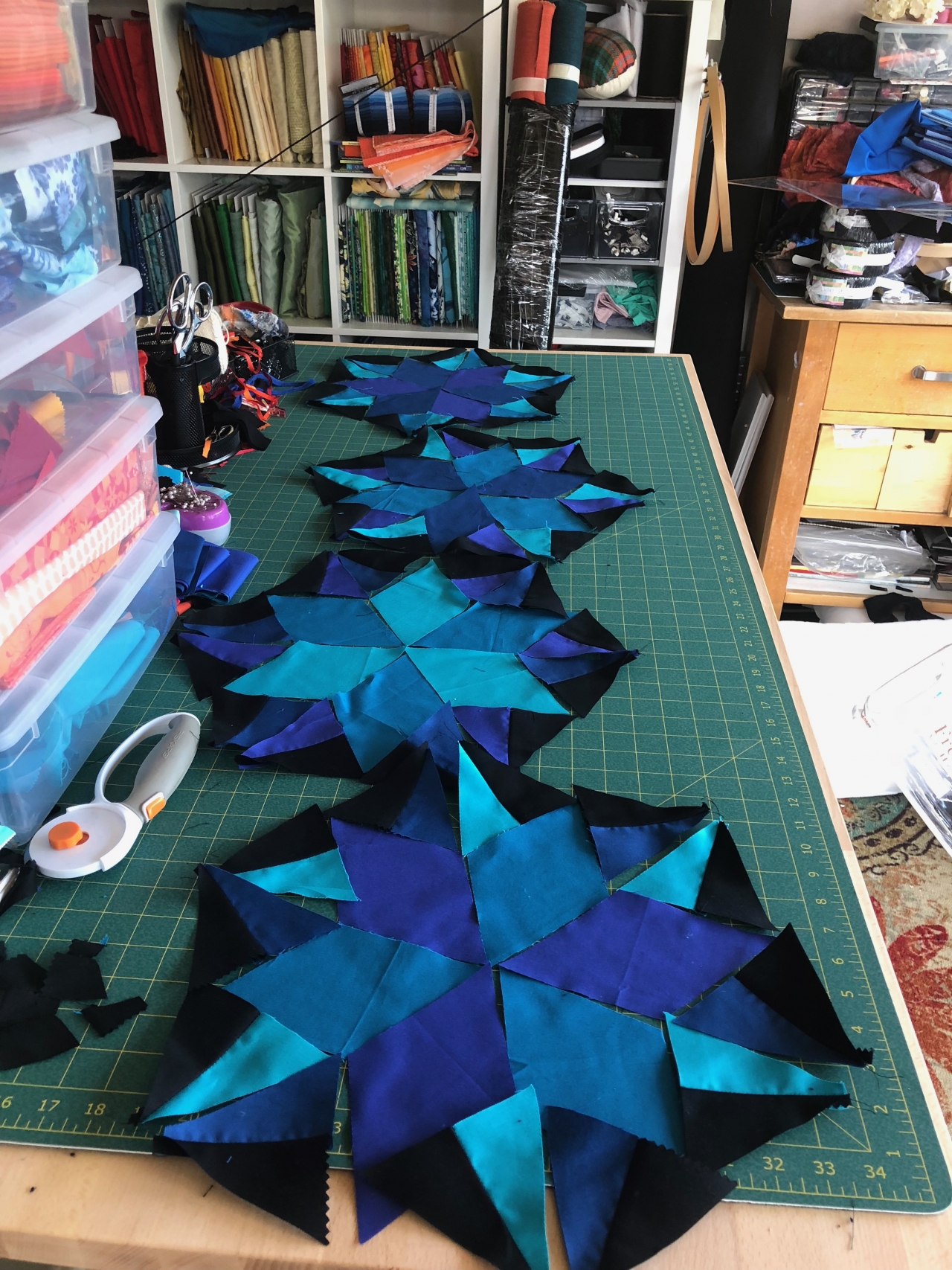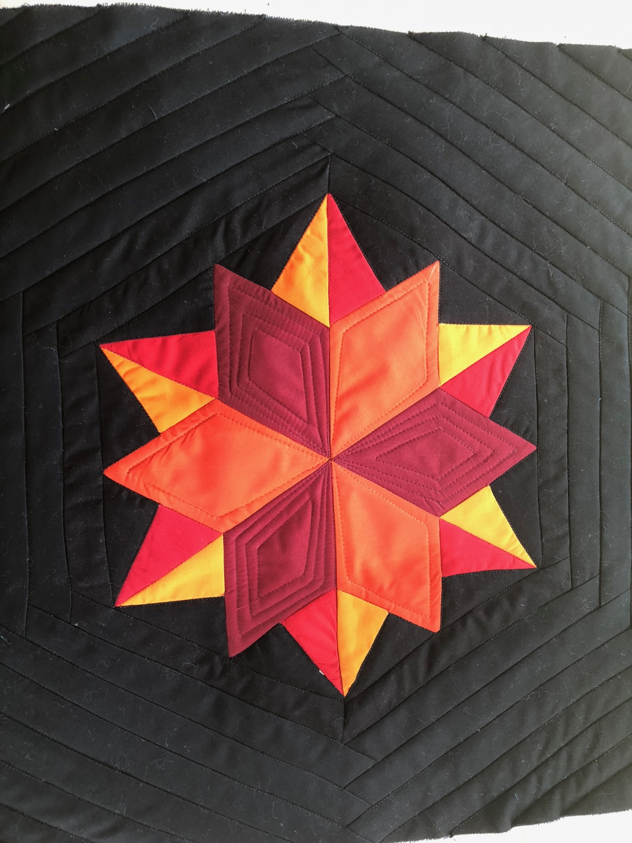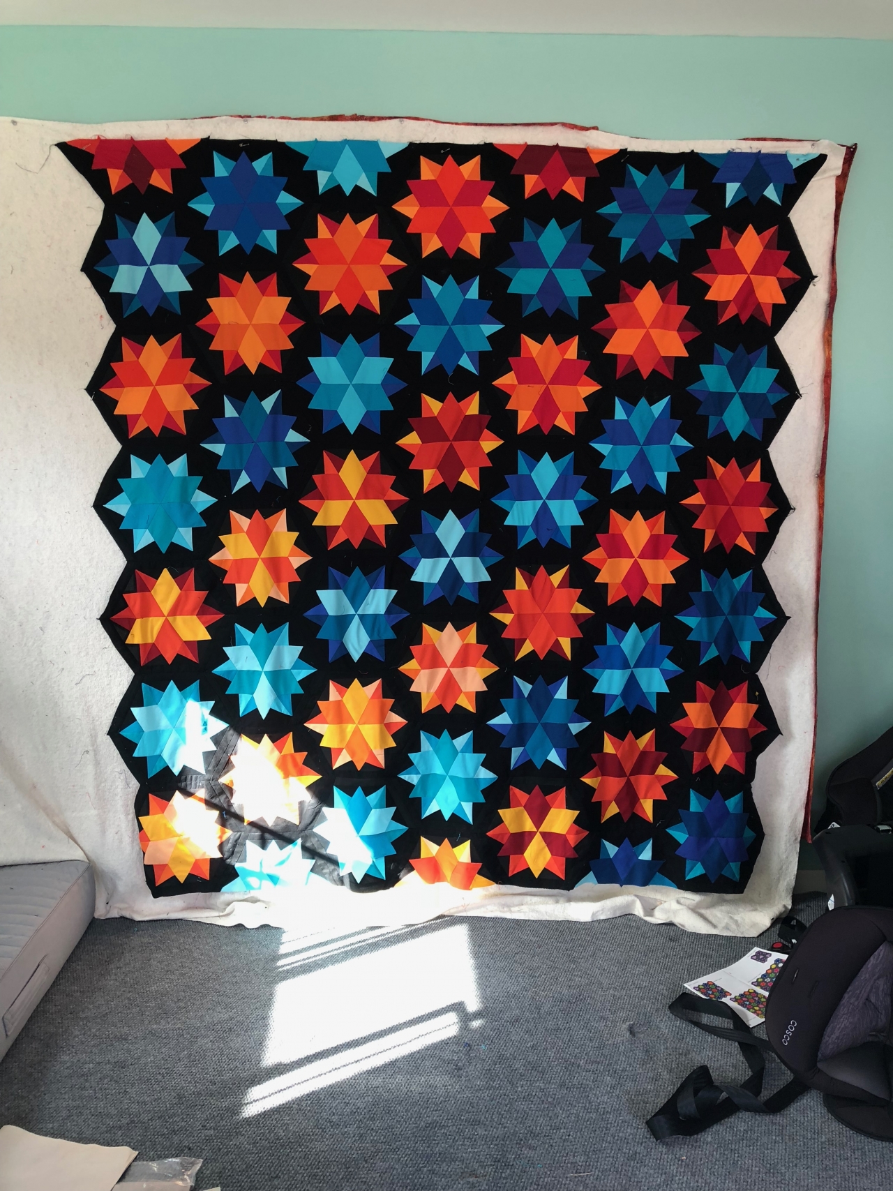 The Jaybird “night sky” pattern, in cyan and orange hues to match our midcentury modern living room. The pillows have been completed and in use for almost a year now, the quilt is allllmost finished to binding, but now that I have a quilt frame it should be done soon.Like all Jaybird patterns, this one looks deceptively difficult but came together quickly. I’ll definitely make more in this style.