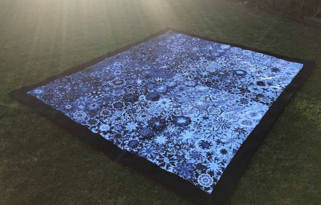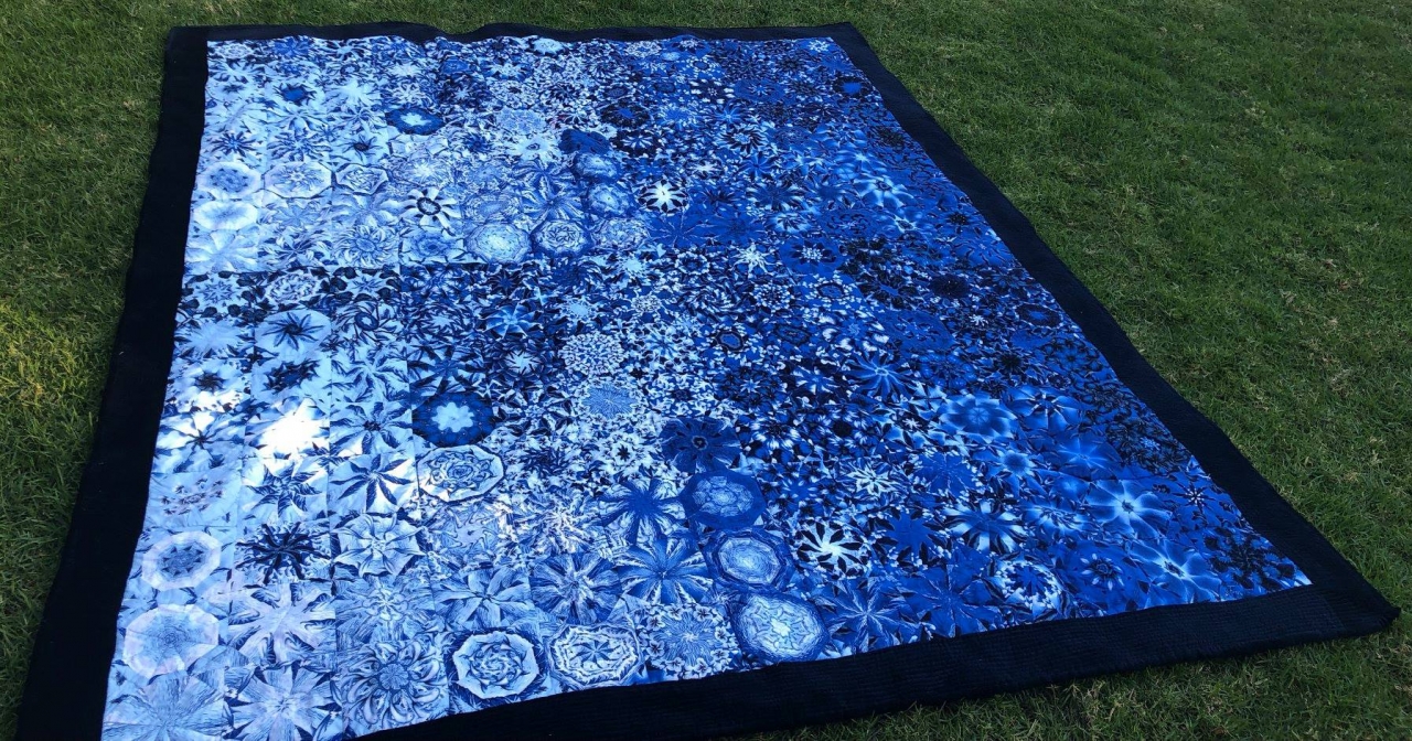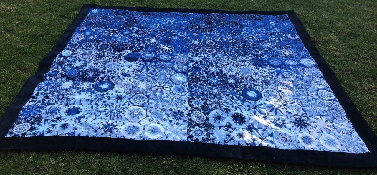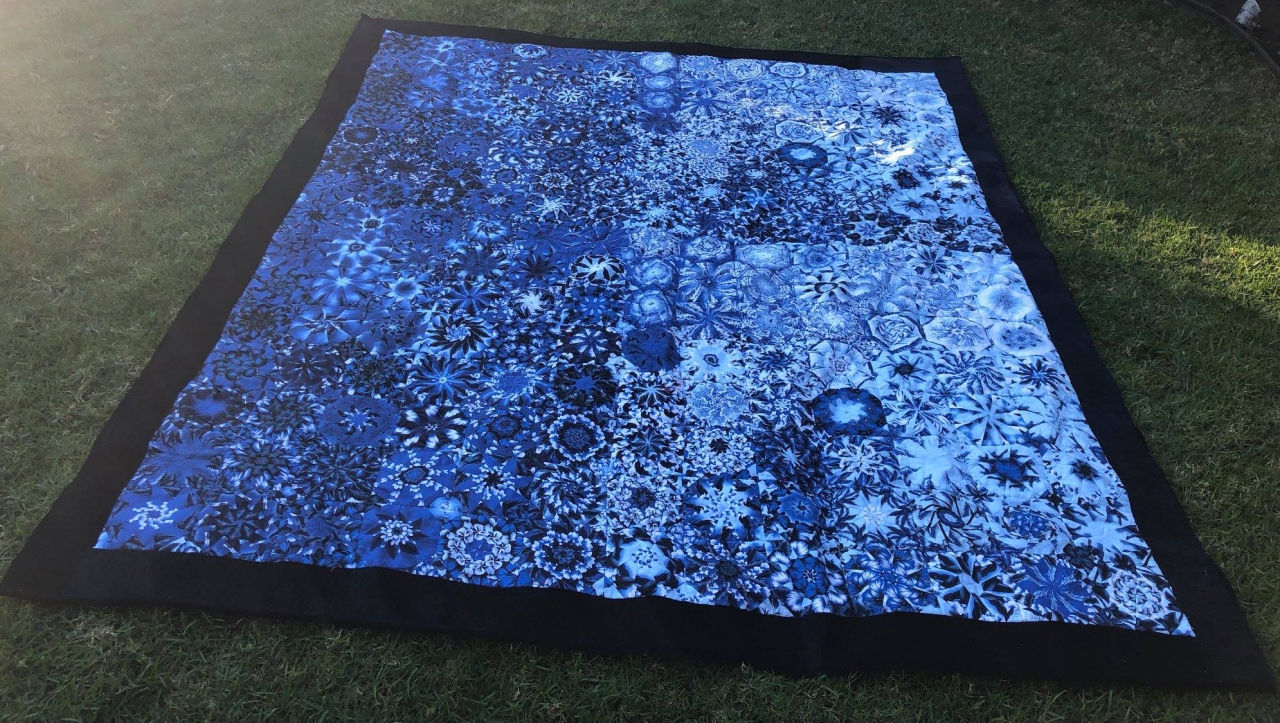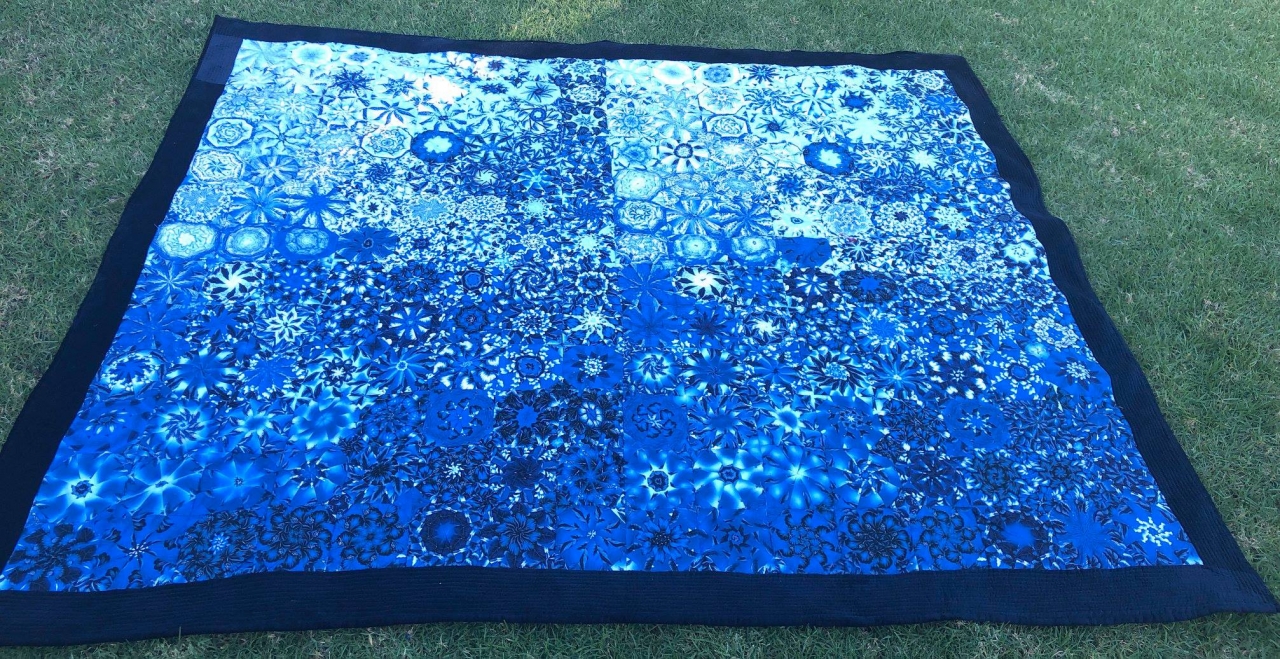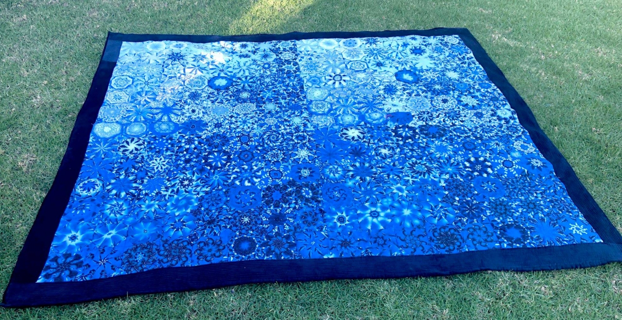 the first quilt I ever began, and it shows! Still, very happy to have it finally completed and in a loving home. Original fabric was a tropical Alexander Henry print. Border is navy cotton velveteen and backing is a blue batik.