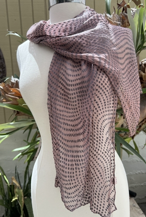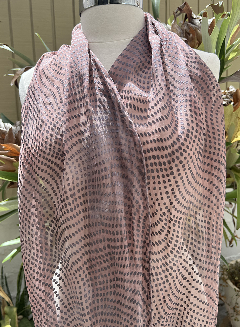 Hand dyed silk and rayon devoré scarf with a dusty pink silk chiffon backing and a black swirling polka dot print in rayon satin. Hand rolled edges.