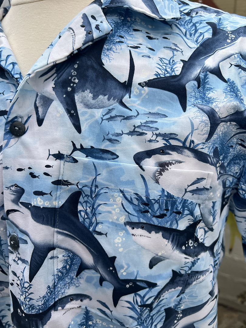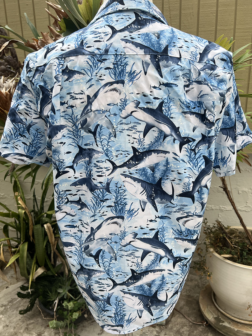 Men’s size L tropical shirt featuring realistic blue sharks on a white and blue background. 100% cotton, blue coconut shell buttons.
