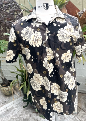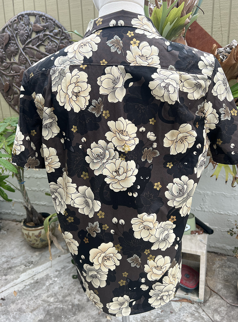 Men’s size L tropical shirt featuring enigmatic black cats, lush cream peonies, and gold metallic floral accents on a warm dark brown background. 100% cotton, carved floral coconut shell buttons.