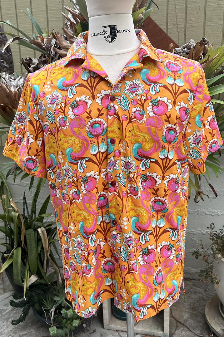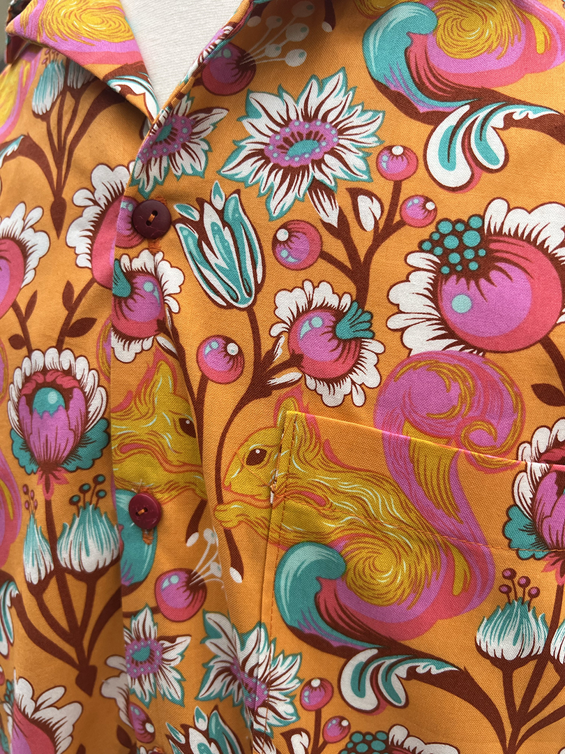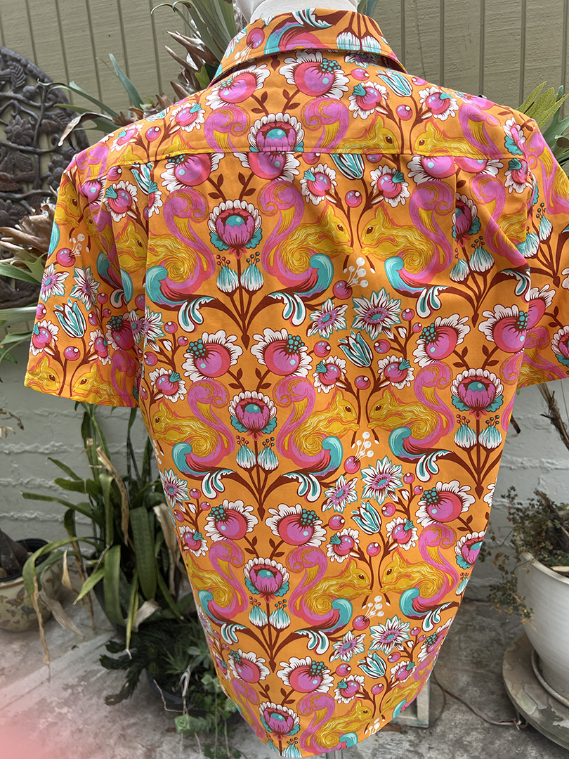 Men’s size L tropical shirt featuring peaceful squirrels and floral motifs in a vibrant orange, yellow and pink colorway. 100% cotton, red coconut shell buttons. Due to this being the last of the fabric I was unable to obsessively pattern match this one, but it’s still a one of a kind conversation starter and a great way to express your love of squirrels to the world.