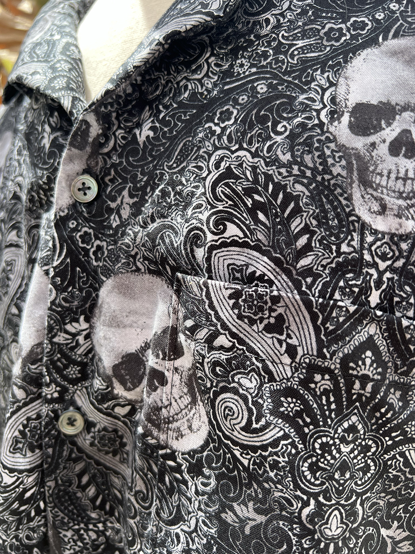 Men’s size XL tropical shirt featuring a gray on black print featuring intricate paisley and skulls. 100% cotton, black mother of pearl buttons.