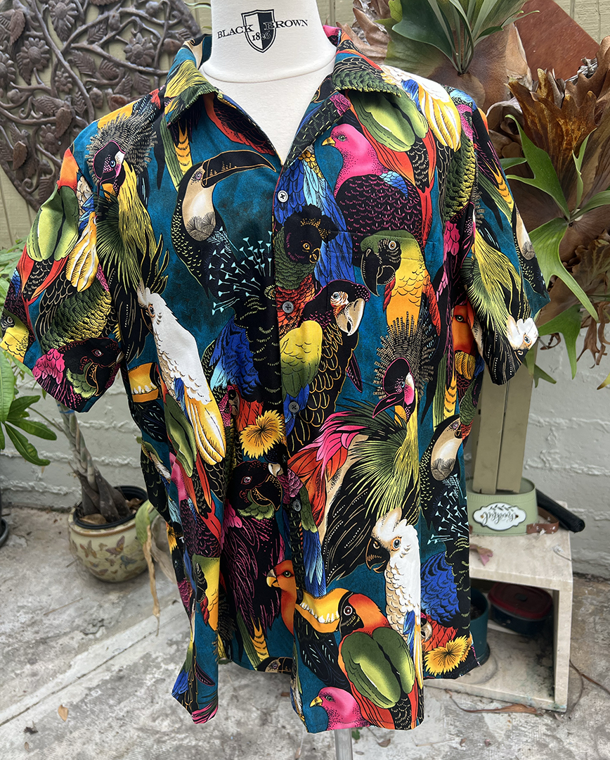 Men’s size XXL tropical shirt featuring gorgeous tropical birds on a deep teal background. 100% cotton, black mother of pearl buttons.